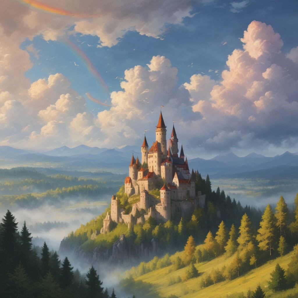 Medieval castle floating in the sky. Sunny, colorful, rainbow, clouds, cloudy, castle in the distance floating in the sky,