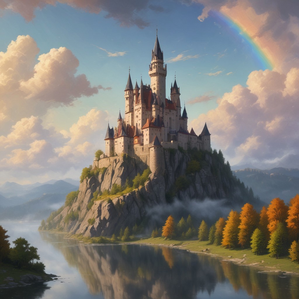 Medieval castle floating in the sky. Sunny, colorful, rainbow, clouds, cloudy, castle in the distance floating in the sky,