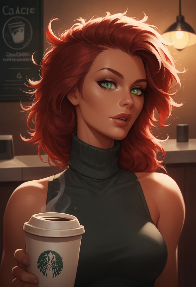 score_9, score_8_up, score_8, coffee shop, moody lighting, sleek white turtleneck, 1girl, sexy girl, solo,38 years old, hair in messy ponytail, green eyes, red hair, ( perky (medium breasts)), (full juicy lips), tan, aroused,sunshine, eye contact, looking seductively at viewer, full color