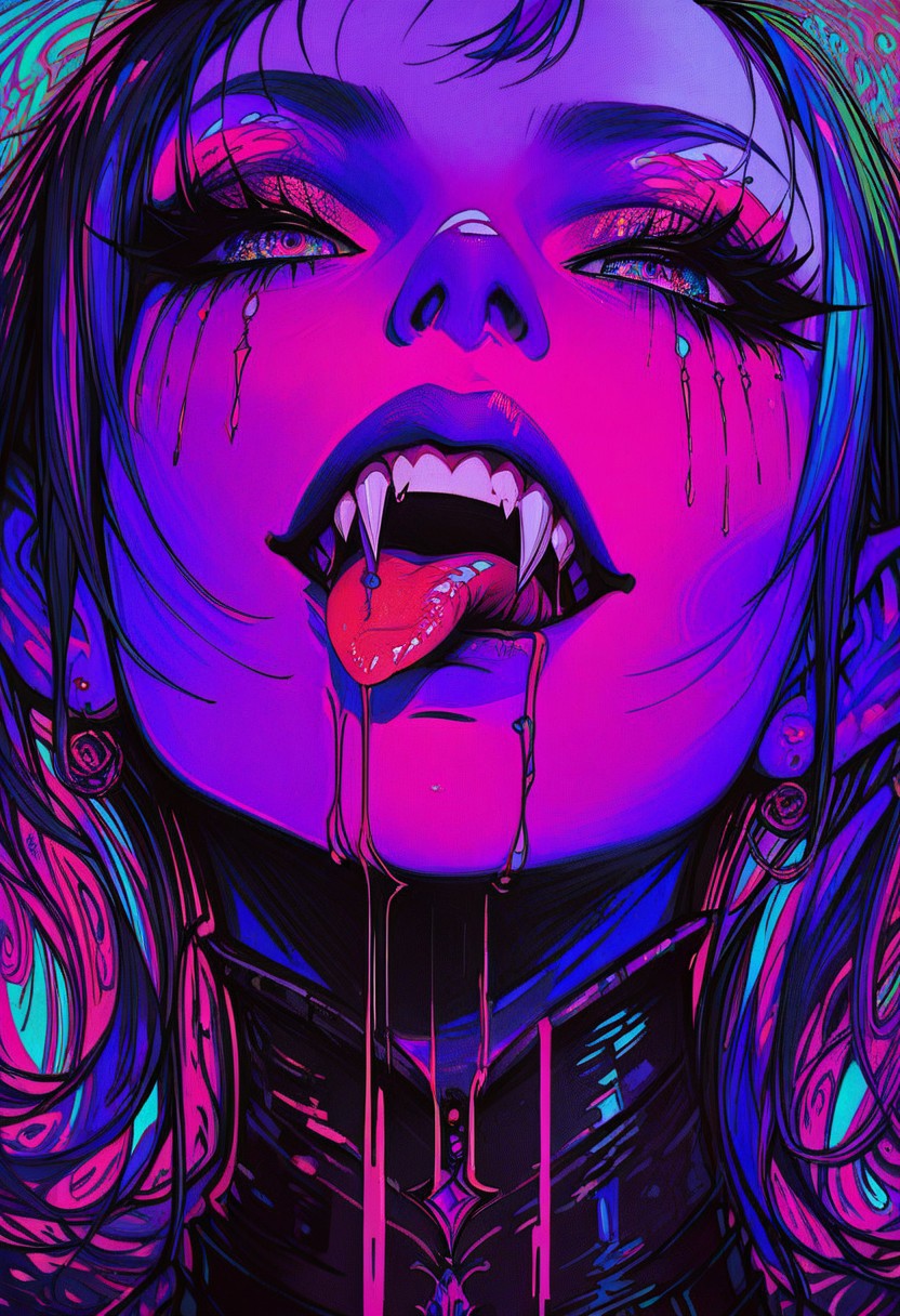 expressiveh, score_9, score_8_up, score_7_up, score_6_up, score_5_up, score_4_up, godrays ,A surreal, digital artwork featuring a close-up of a wide-open mouth with sharp, fang-like teeth. The tongue is elongated and dripping with a swirling, psychedelic liquid in hues of blue, purple, and pink. The background is dark, emphasizing the vibrant, trippy effect. The style is abstract and dreamlike, reminiscent of 1960s psychedelic art.