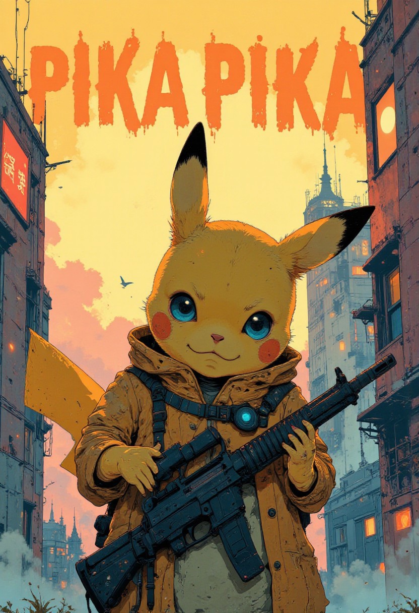 A graphic illustration featuring a Pikachu, the iconic Pokémon, in an unexpected scenario. Instead of its usual cheerful demeanor and playful gestures, Pikachu is depicted with a serious expression, holding an assault rifle. The art style is reminiscent of soft pastel anime, with the background composed of gentle, blurred colors that create a serene and somewhat unsettling juxtaposition with the foreground's stark reality. Pikachu's fur is rendered in soft shades of yellow and brown, while its eyes are a piercing electric blue that seem to hold a sense of determination and perhaps a touch of fear. The rifle, a stark black contrast to the pastel setting, appears almost too large for its small hands, emphasizing the gravity of the situation. The muzzle of the gun is pointed downward, suggesting a moment of contemplation rather than immediate danger. The scene takes place in a dystopian cityscape at dawn, with buildings in the background displaying a mix of pastel pinks, purples, and blues, their windows glowing with a warm light. The sky is a blend of muted oranges and yellows, hinting at a hopeful sunrise despite the heavy atmosphere. The word 'PIKA PIKA!' is prominently displayed at the top in bold, flaming text, emphasizing a darkly humorous and apocalyptic theme. The background consists of a gradient of yellow tones, creating an intense and dramatic atmosphere. The illustration is minimalistic yet impactful, focusing on strong contrasts and symbolic imagery.