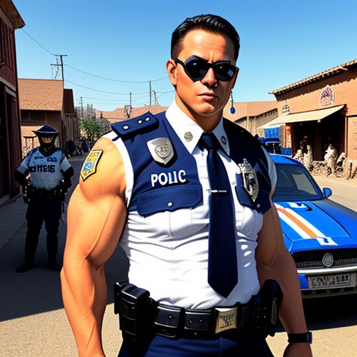 photograph, of a glistening sweaty skin, very tall lean muscular 18yo, Caucasian bodybuilder man 22nd century police officer wearing a sleeveless policeman’s shirt that is unbuttoned and police officer’s pants standing next to his futuristic police car in a 19th century western dusty town with horses and carriages and he wears sunglasses and earrings