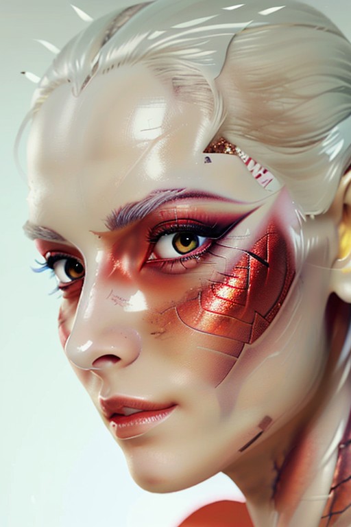 a (extreme close up) of an android with (bright red eyes iris and white hair ) and face makeup, (pale snake skin with scales) BREAK SNEKPPL, very detailed skin, italian shot, lens flare, spot lights, sharp focus, intrincate details