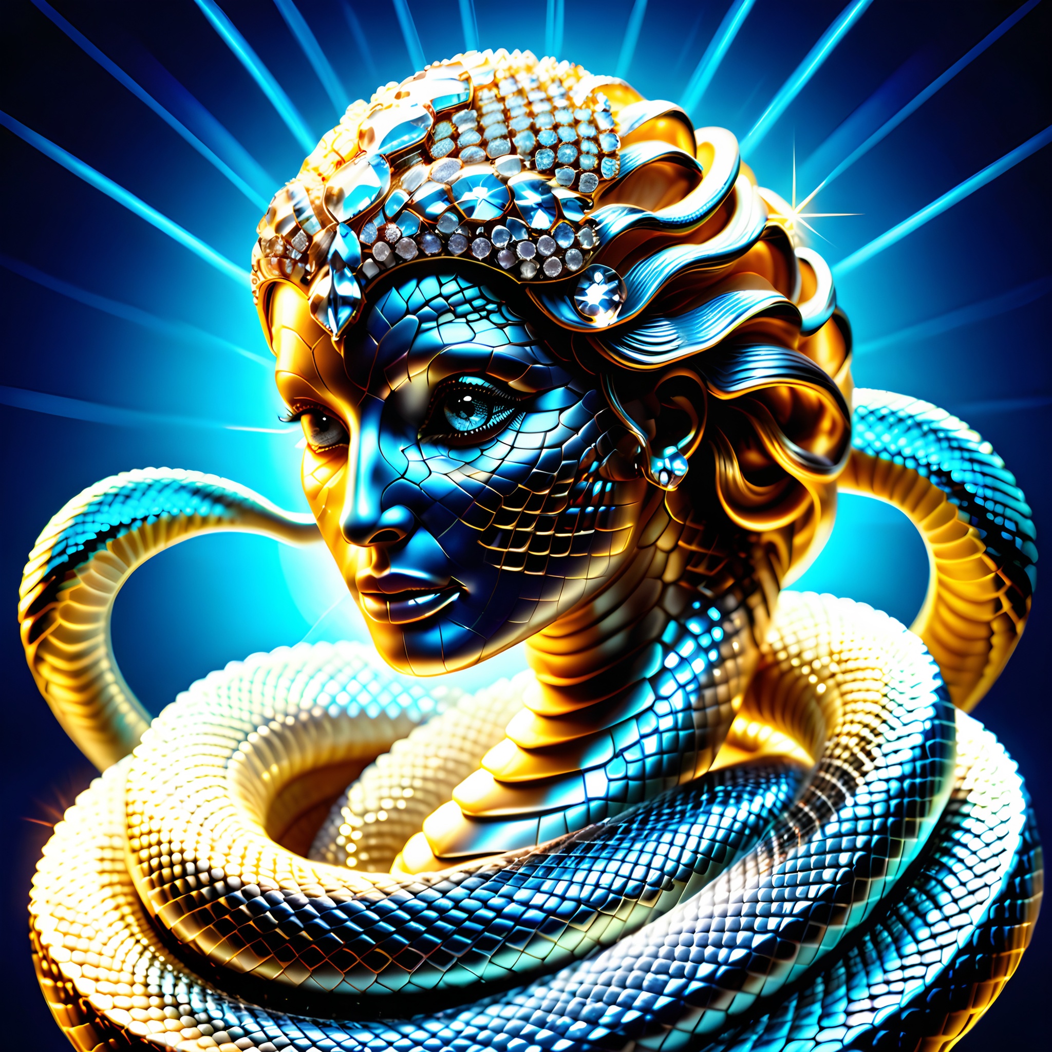 beautiful female godess hydra made of diamonds, growing cute friendly looking snakes out of the head, countless diamonds, iridescent blue, bokey background, crepuscular rays