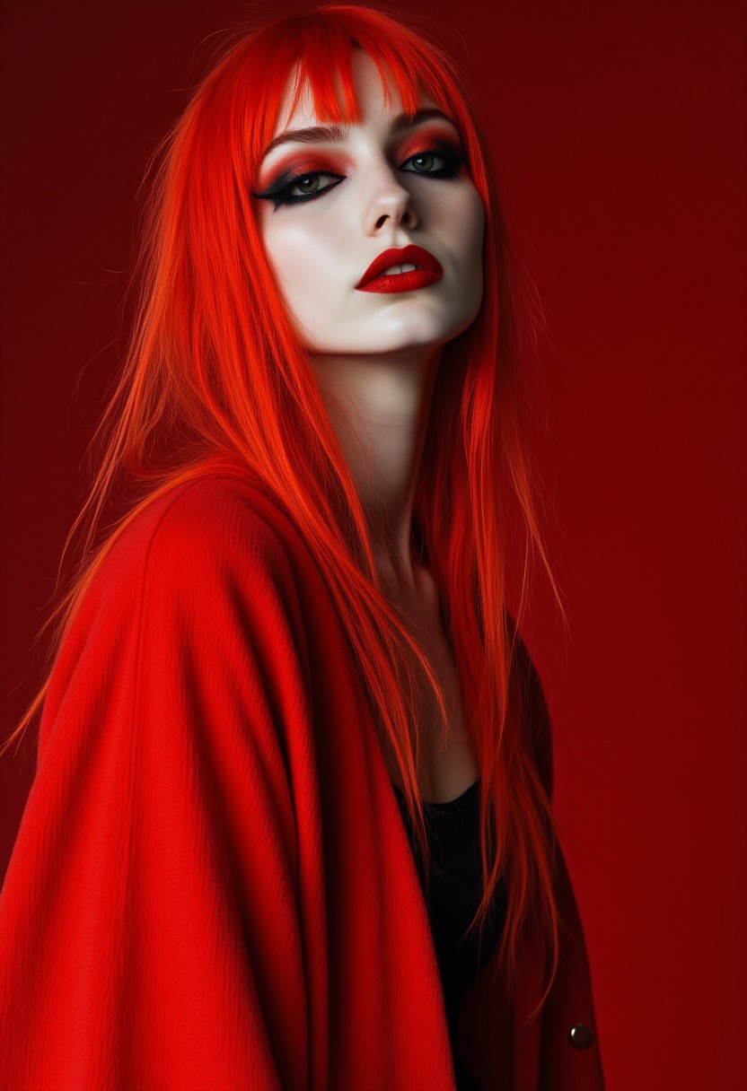 FictionalEmber,bright red hair,heavy black eye makeup and intense red lips. Rising up from a pit of flames in a red cloak