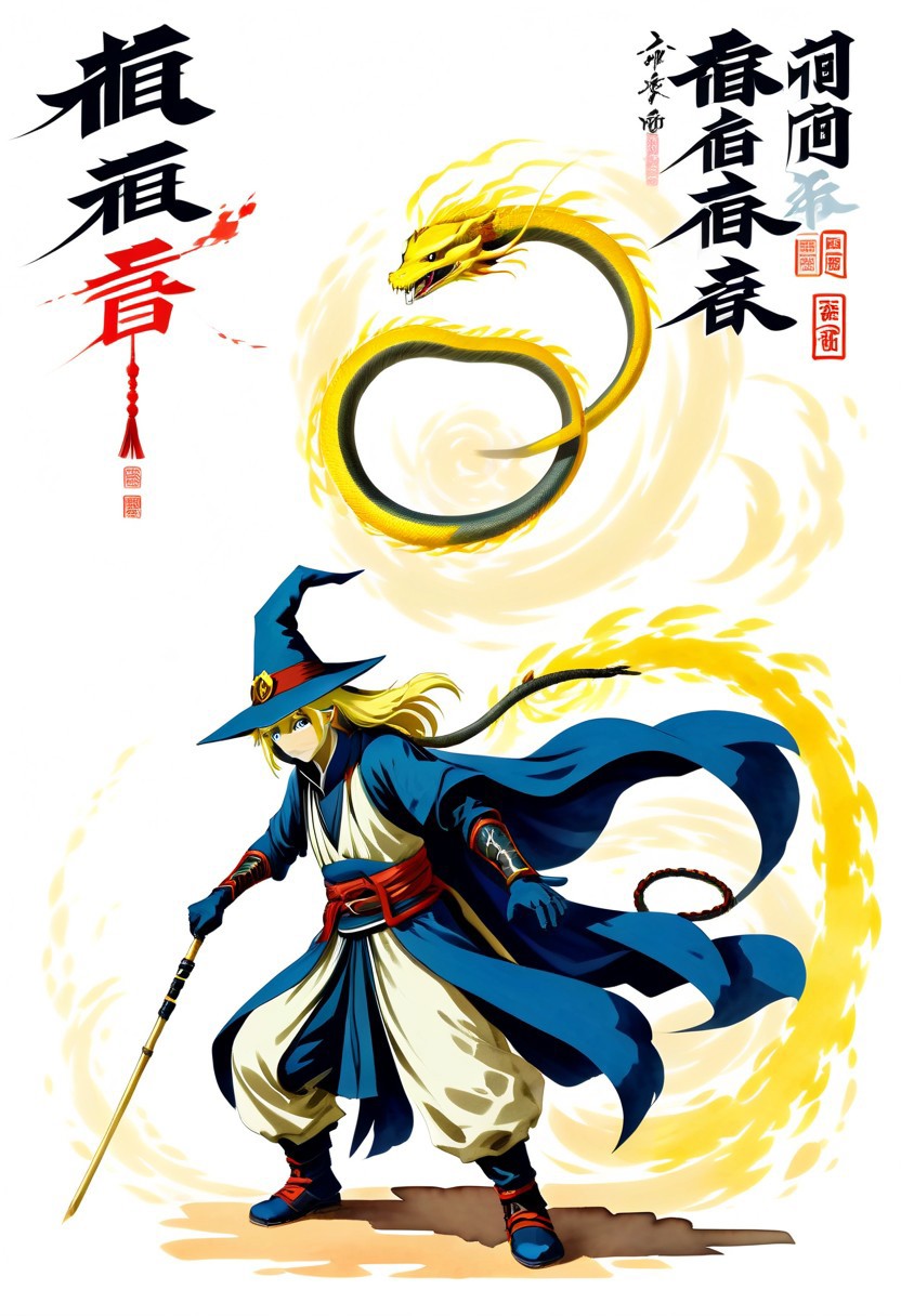 score_9, score_8_up, score_7_up, 1boy, solo, wizardmon, gray skin, green eyes, long hair, blonde hair, cape, hat, staff, boots, gloves, summoning a snake