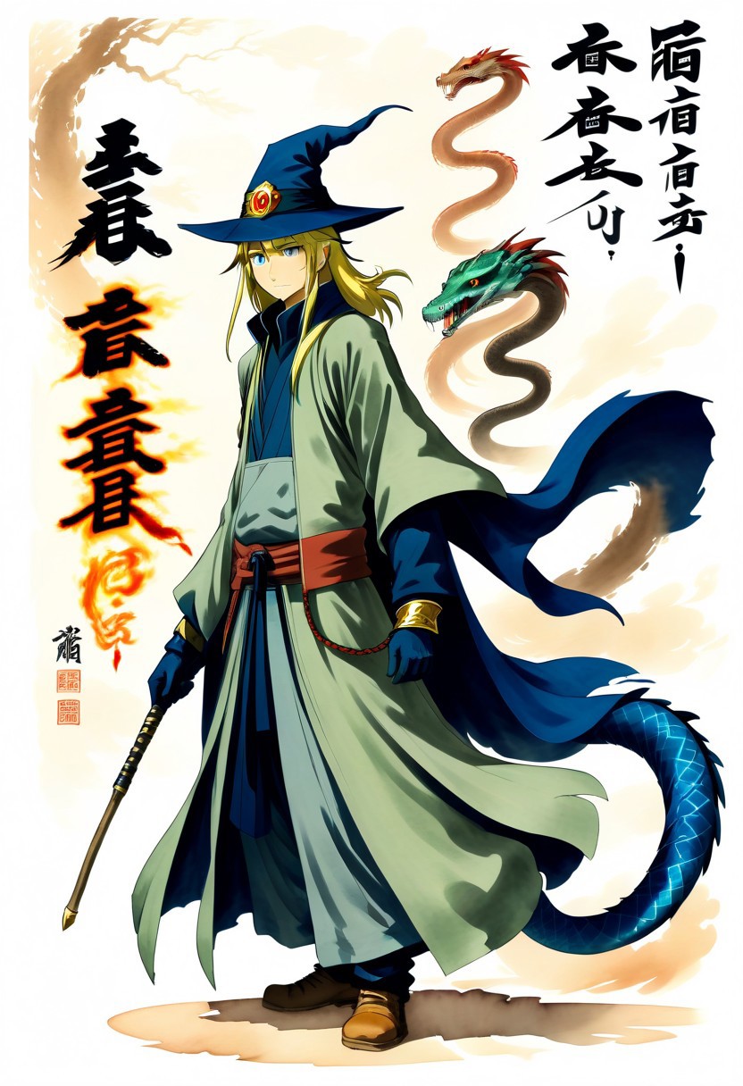 score_9, score_8_up, score_7_up, 1boy, solo, wizardmon, gray skin, green eyes, long hair, blonde hair, cape, hat, staff, boots, gloves, summoning a snake