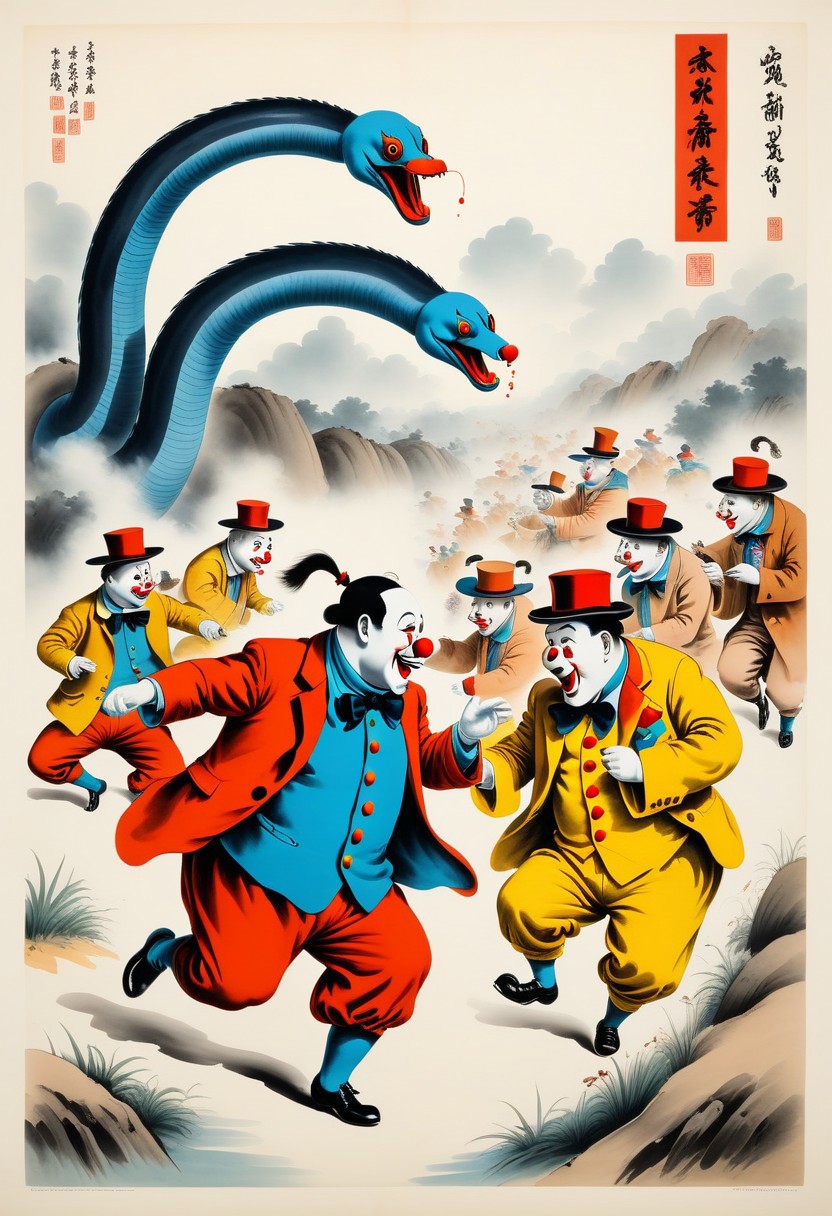 score_9, score_8_up, score_7_up, score_6_up, Sinoink, (Mao Zedong snake man, dressed as clown, clown makeup, clown wig, clown shoes, buffoon), being chased by a black bear