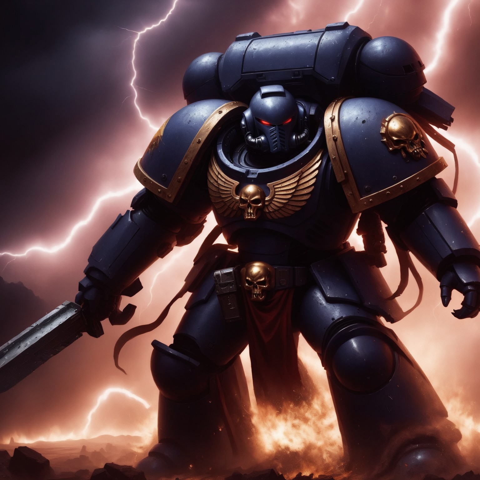 stunning artwork, dark, chiaroscuro, low-key, DarkFantasy, Awesome war hammer 40k space marine, Imperium of Man, Ultra Marine, Squad is landing via JetPack actuation, crushing enemy Tyrranid skull, holding +5 lightning hammer of Thanos, thunder hammer powered super soldier from the grim dark future of endless war, epic lighting, perfect battlefield background, smoldering alien carcasses, thunder clouds, distant crack of lightning