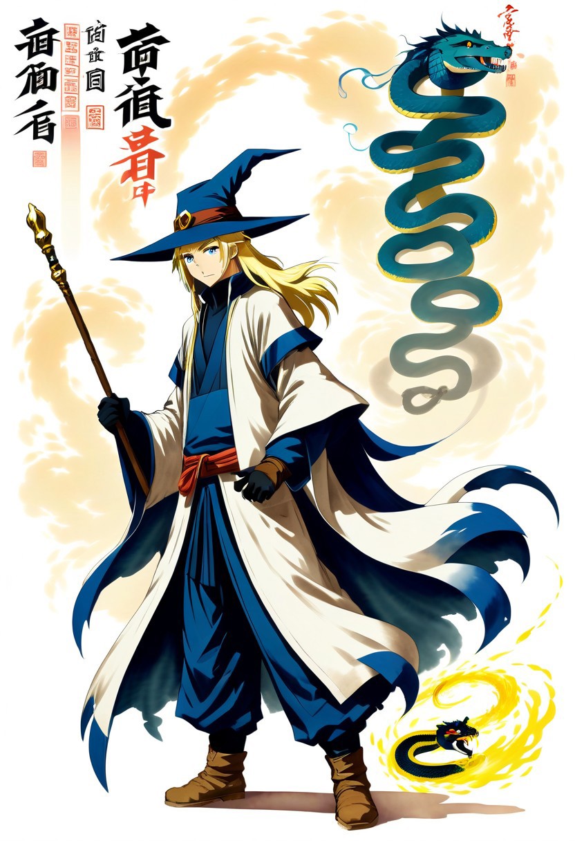 score_9, score_8_up, score_7_up, 1boy, solo, wizardmon, gray skin, green eyes, long hair, blonde hair, cape, hat, staff, boots, gloves, summoning a snake
