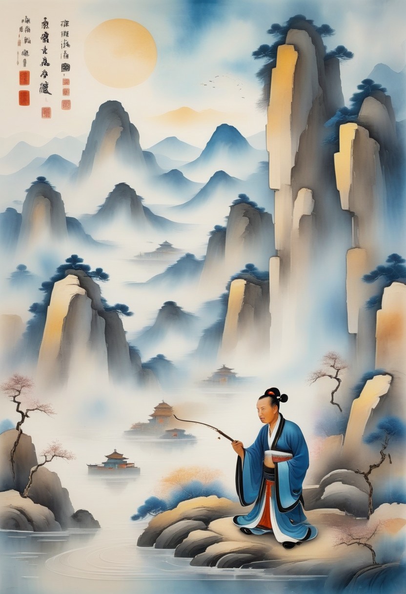 A Chinese snake charmer dances with snakes crawling at his feet. The background is an abstract Chinese mountain landscape 9Sinoink, pasartce)
