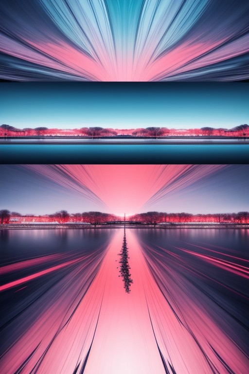 minimalism, abstract, orange, fuchsia, blue, perspective, double exposure, waterfront in winter, surreal, hyper-detailed, intricate details, professional photo, vivid colors, full-scene view