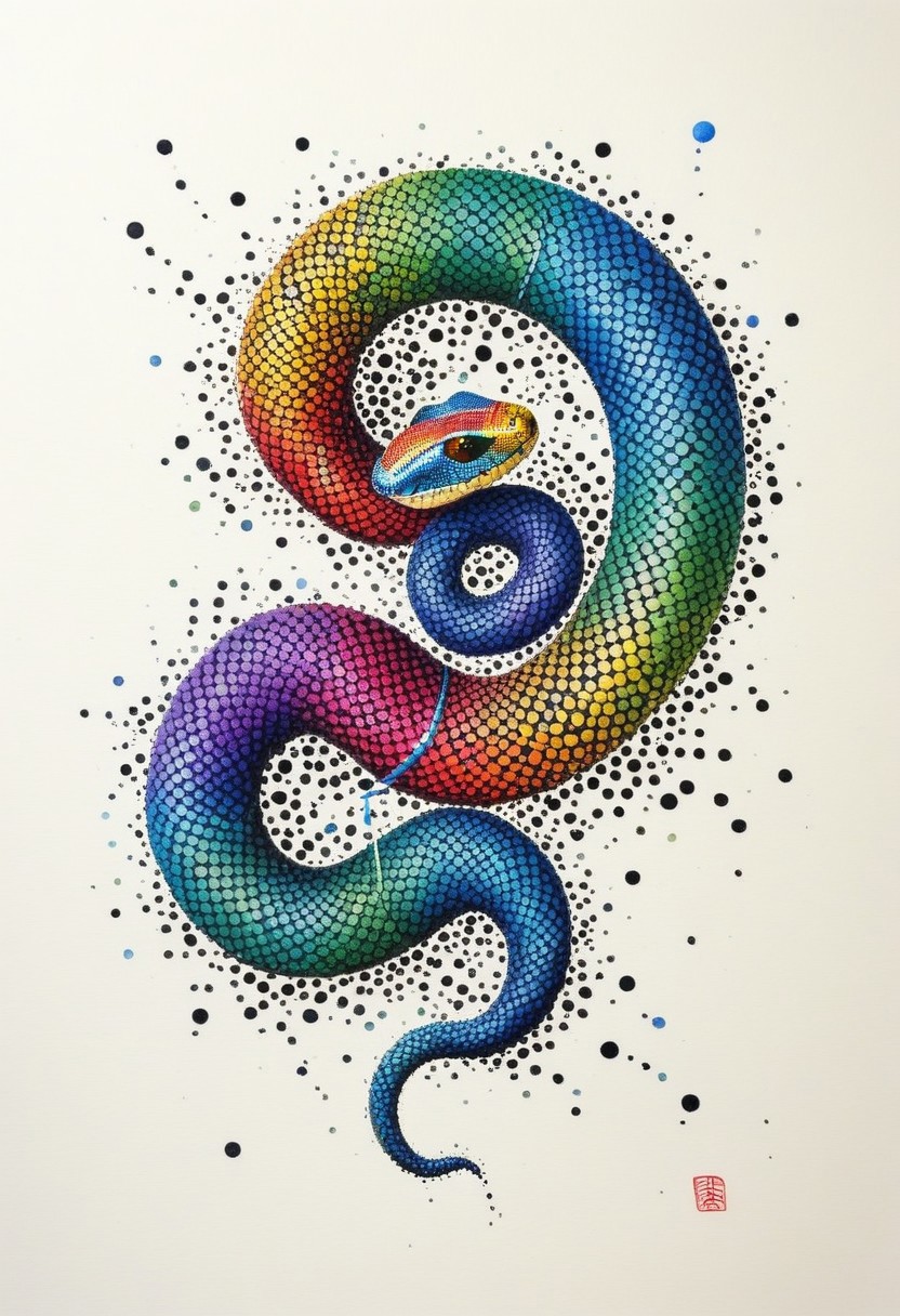 Snake dancing around calligraphy brush, pointillismstyle dots, colorfull pallet, Sinoink