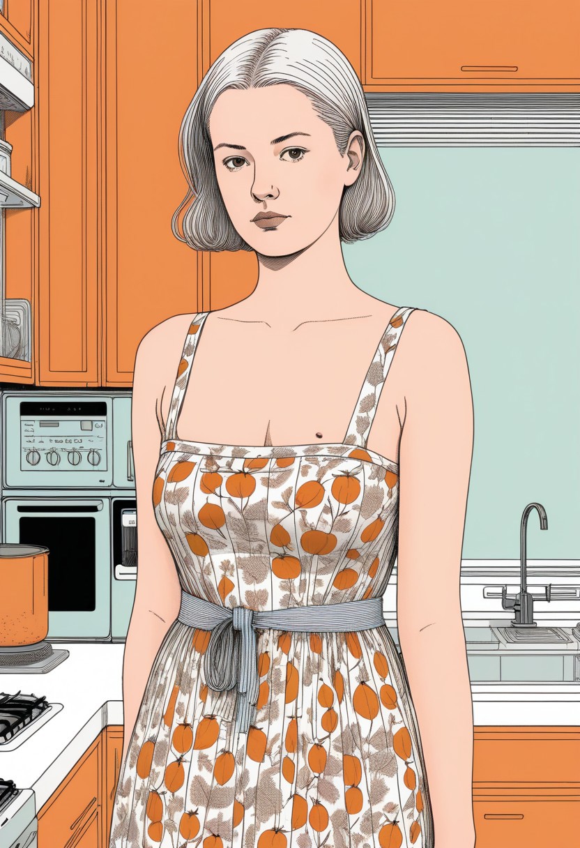a drawing of a 19yo woman in a autumnal sundress, thin waist, gaspar noe, daniel clowes, highly detailed panel cuts, 3 5 °, frank quitely, fingers, centred position, by Holger Roed, descriptive, cuisine, curvy, intimate holding close, home video, tumblr, roleplay,