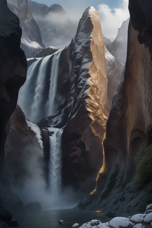 fairy tale castle on a (rock spire), worn white and gold detailing, tattered flags, waterfall disappearing into the misty depths below the rock spire, mountain in background, precariously high up, extremely long rope bridge, extremely long rope on pulley disappears into the distance, best quality, masterpiece, illustration, realistic, photo-realistic, extremely detailed