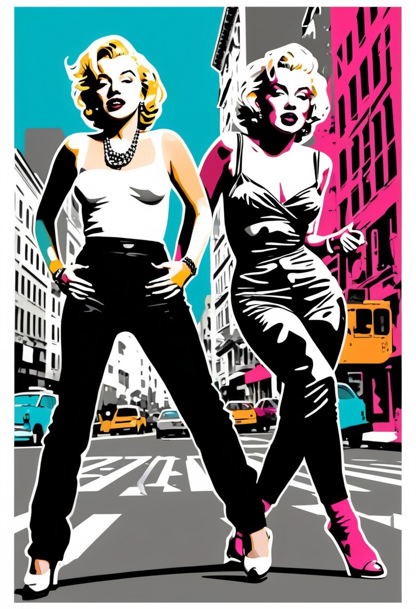 Stencil mode, bold shapes, flat colors, era 2000s street art, casual attire, duo, stencil art style, Marilyn Monroe, punkrock, dramatic action pose, outlined against a vibrant city backdrop, the flat colors and bold shapes creating a dynamic visual effect, high-contrast filter. posterized, stencil