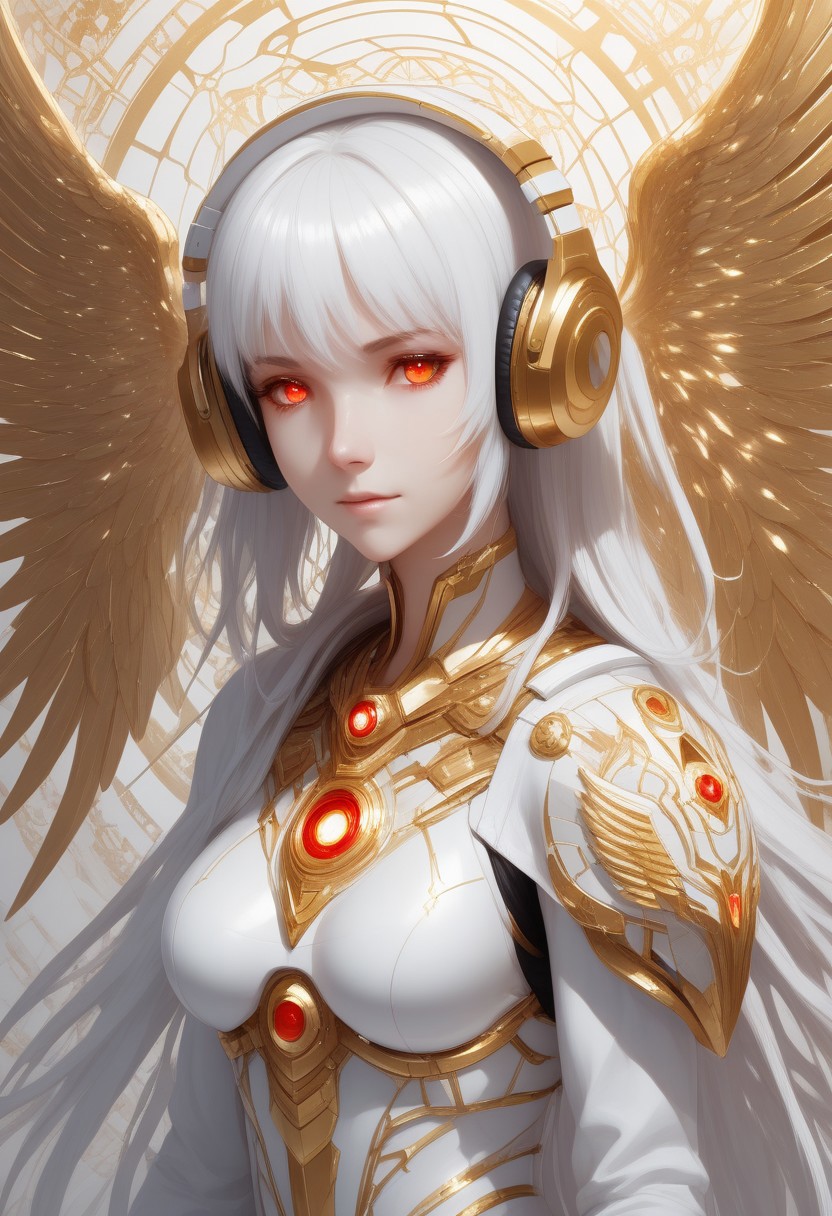 (masterpiece), best quality, Anime, ((planet, outer space)), White Background, No Humans, Gold and White Theme, Gold Filigree, (Light Refraction), Symphtia-Style, Zyrnox-Exoterra Style, (1girl, white hair, red eyes, holding cube, headphones, goddess, angel wings, futuristic)