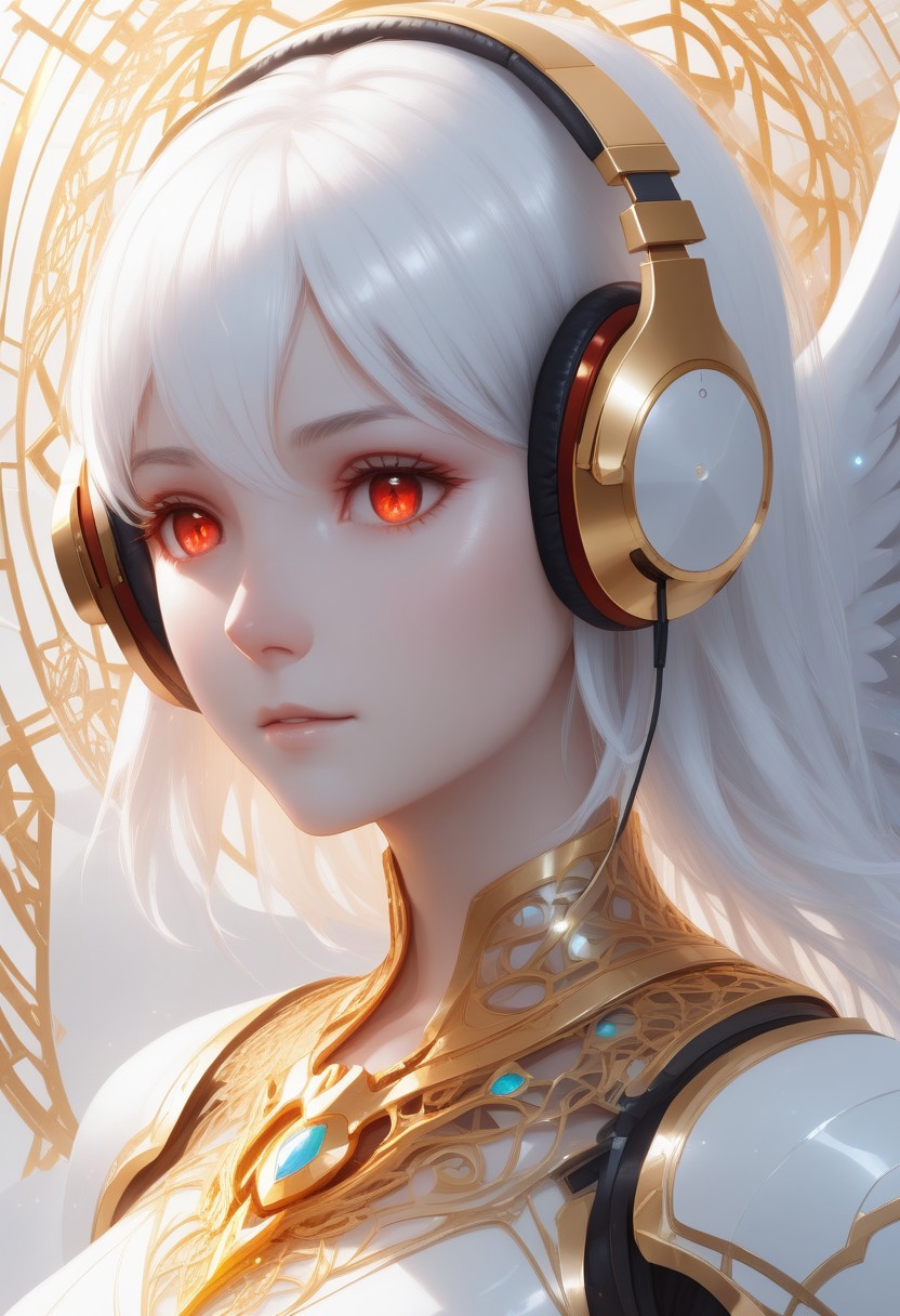 (masterpiece), best quality, Anime, ((planet, outer space)), White Background, No Humans, Gold and White Theme, Gold Filigree, (Light Refraction), Symphtia-Style, Zyrnox-Exoterra Style, (1girl, white hair, red eyes, holding cube, headphones, goddess, angel wings, futuristic)