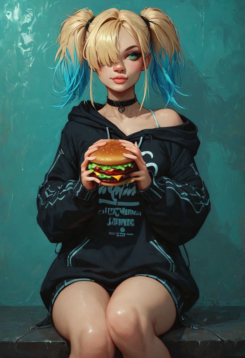 core_9, score_8_up, score_7_up,score_6_up, 1dk, bright colours, rating_safe, style_comic, woman holding a burger in a diner. 1girl, solo, green eyes, two toned hair, blonde hair, blue hair, twintails, hair over one eye, bangs, long oversized hoodie, black choker, bare legs, tiny medium breasts. restaurant diner background. neon signs.