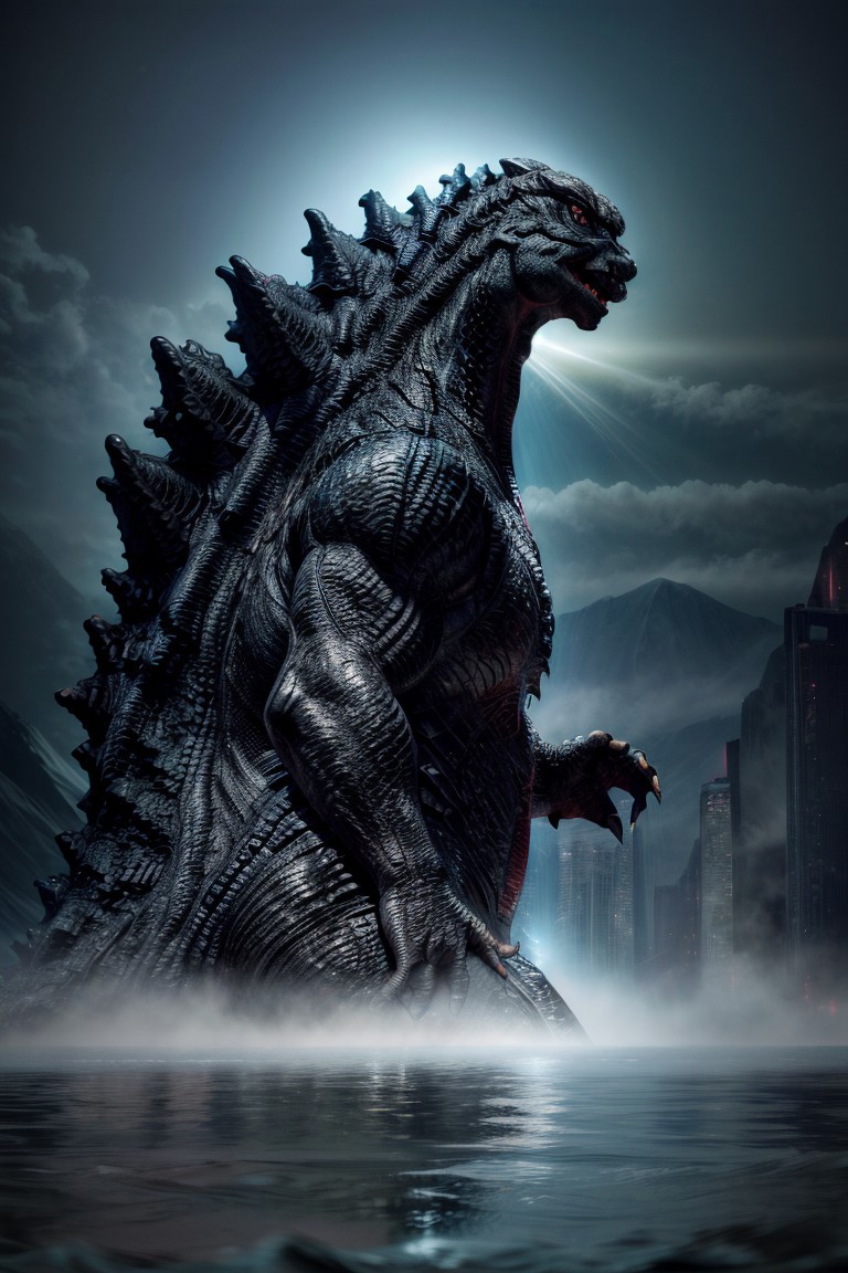 Godzilla wades through lake, monster-focus, lake in the mountains, no humans in the photo, <lora:cinematic dramatic color style v1:1>,cinematic dramatic color style,<lora:MGWR_Cine:0.3>,mgwr/cine, godzilla, solo, surfaces from the lake, ((godzilla)) head out of the water, godzilla, partially submerged, poking its head out of the water,photograph, technicolor, dream-like, bright misty rose, dense foliage