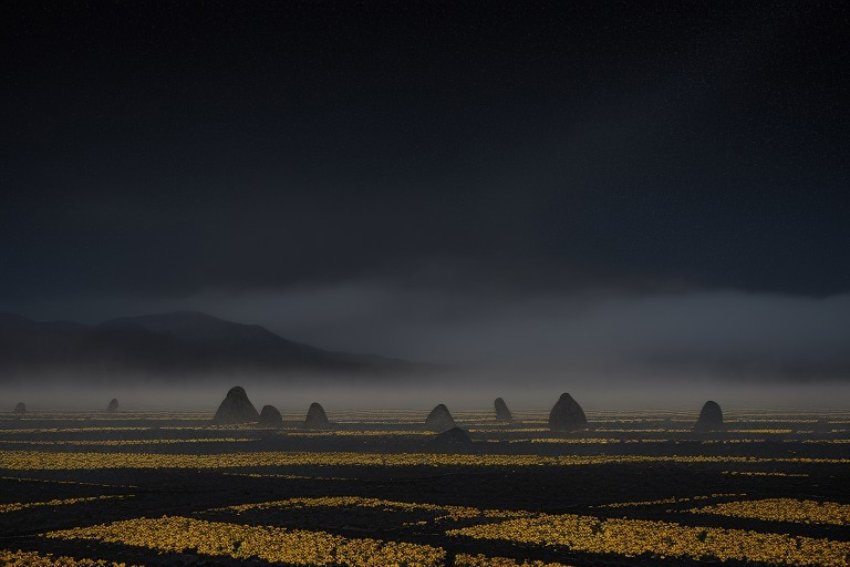 overlooking desert filled with large glassy stones, giant stone outcroppings, ((desert are filled with large dark yellow stones)), ((fields of dark yellow glassy stones)), ((many dark yellow glassy stones strewn on the land)), ((gold mineral vein in many stones)), on dry lake bed, mountains in the distance, foggy, place is filled with fog, rocks are exposed to the wind, minerals protruding from the ground, ((tall blue trees pointing out of the mist)), ((wind blowing dark yellow dust crystals)), ((raining fog)), (((night time))), darkness, raining at night