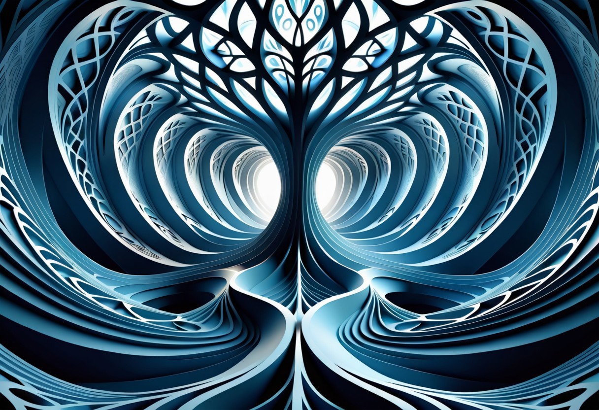 Create a visually stunning, mathematically intricate phalic scene that blends nature-inspired fractal patterns with the shadows of higher-dimensional geometric shapes. Incorporate elements such as delicate fractal trees, flowing water motifs, and organic phallic symmetry, seamlessly intertwined with ethereal, multi-dimensional shadows that suggest unseen dimensions. Utilize gradient lighting to highlight depth and complexity, balancing the serene beauty of natural forms with the enigmatic elegance of advanced mathematical structures. The composition should be both challenging to render and aesthetically captivating, showcasing infinite symmetry and intricate details that evoke a sense of wonder and complexity.