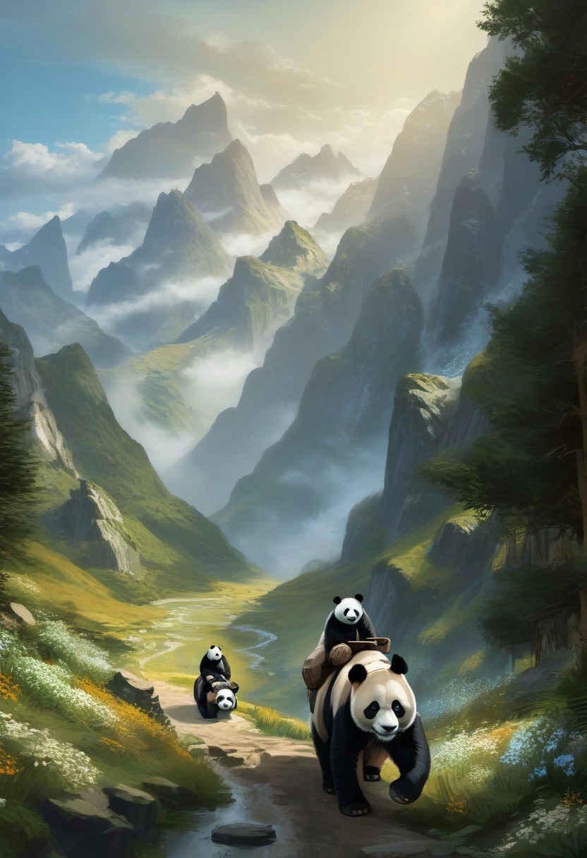 digital art, mountail landscape backgound, plants tress and flowers, a man riding on a Panda through a valley