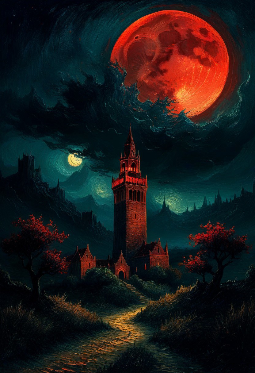 mystic fantasy scene, van gogh style, dark tower, red moon, nighttime, epic fantasy scene, van gogh style, sharp, night, surreal, fantasy, ultra quality, 8k, best quality, masterpiece, detailxl, max details, midjourneyv6.1