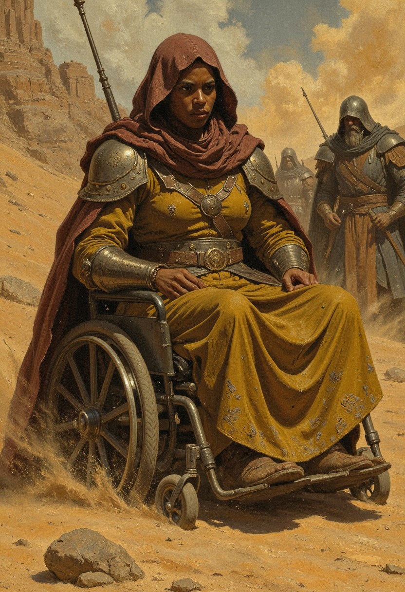 Roland Deschain and his ka-tet, including Susannah, caught in a fierce sandstorm in the vast deserts of Mid-World. Susannah’s wheelchair is partially covered by the swirling sands, her face shielded by a scarf, eyes squinting through the gritty wind, black woman in wheel chair
