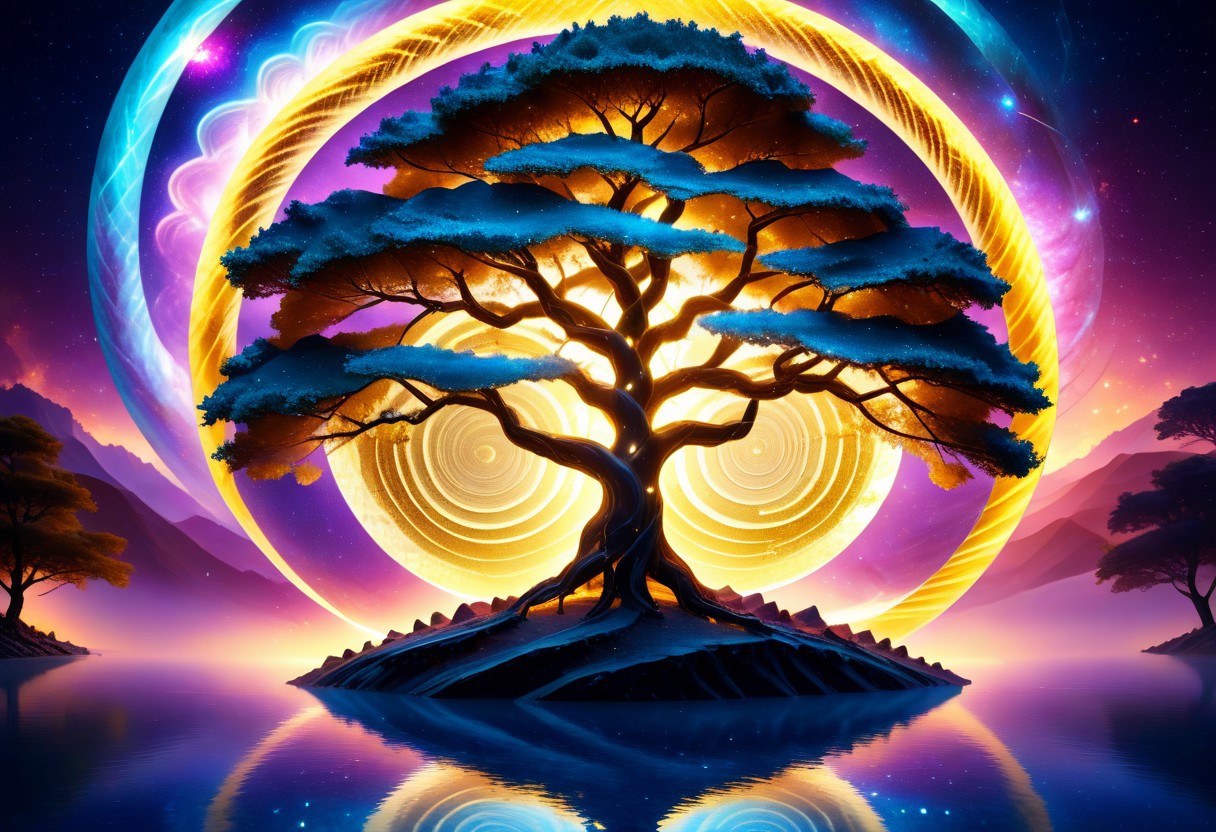 hyper detailed, water horizon, divine fluorite mineral tree emerges from water, encircled tree, spiral , golden glow, vibrant glow, golden lake, golden dust, sparkles, glitter , countless diamonds, diamondMW midjourneyv6.1, iridescent, galaxy background