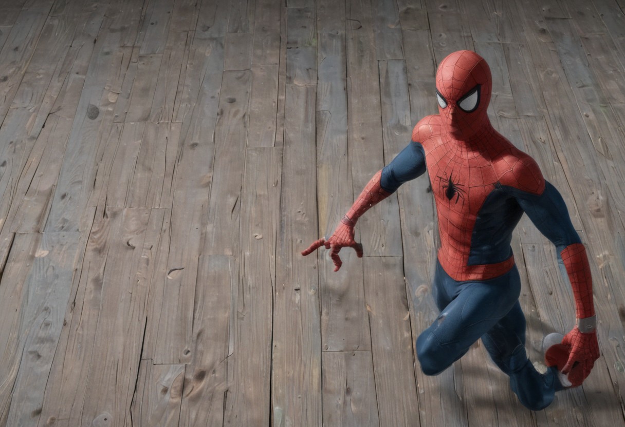 Generate a high-detail, ultra-realistic 3D model of Spider-Man standing in a dramatic pose on a weathered wooden floor, inspired by the styles of Gu Hongzhong and Pan Ren Wei, specifically in a cobalt color scheme reminiscent of Erosion Hand Forest. The model should be in hero proportions, with an ultra-wide-angle perspective, and incorporate micro details. The output should be a 1088p, high-quality screenshot, akin to a production-quality cinema asset, suitable for a Weibo package cover or a featured art piece on ArtStation, created using Unreal Engine 5.