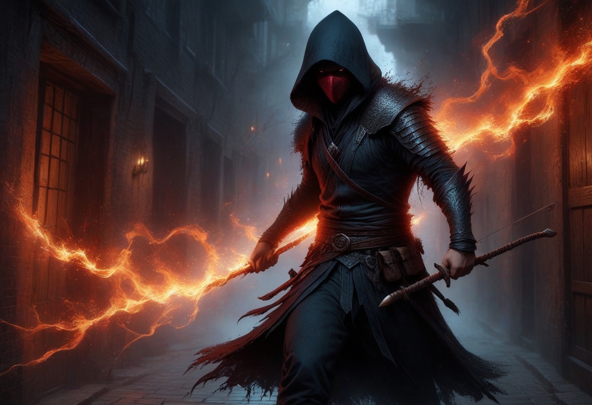 A human rogue assassin with a blend of fantasy and tactical elements, designed for stealth and precision. The character wears a sleek, form-fitting outfit made for silent movement, adorned with intricate glowing red patterns resembling draconic scales. A hooded cloak drapes over their shoulders, enhancing their enigmatic and shadowy presence. Their face is partially concealed by a minimalist tactical mask, revealing only piercing eyes that convey intelligence and deadly focus. They hold an ornate longbow engraved with glowing runes, exuding an aura of mysticism, and twin daggers are securely strapped to their belt, ready for swift, lethal strikes. The character stands confidently, their posture embodying cunning and lethality. The background is a dimly lit, narrow alley, with soft red and orange glows emanating from scattered embers and magical light sources, creating an atmosphere of danger and intrigue, Full body.