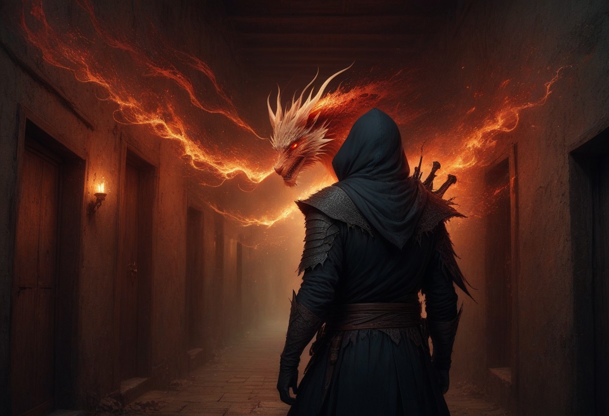 A human rogue assassin with a blend of fantasy and tactical elements, designed for stealth and precision. The character wears a sleek, form-fitting outfit made for silent movement, adorned with intricate glowing red patterns resembling draconic scales. A hooded cloak drapes over their shoulders, enhancing their enigmatic and shadowy presence. Their face is partially concealed by a minimalist tactical mask, revealing only piercing eyes that convey intelligence and deadly focus. They hold an ornate longbow engraved with glowing runes, exuding an aura of mysticism, and twin daggers are securely strapped to their belt, ready for swift, lethal strikes. The character stands confidently, their posture embodying cunning and lethality. The background is a dimly lit, narrow alley, with soft red and orange glows emanating from scattered embers and magical light sources, creating an atmosphere of danger and intrigue.