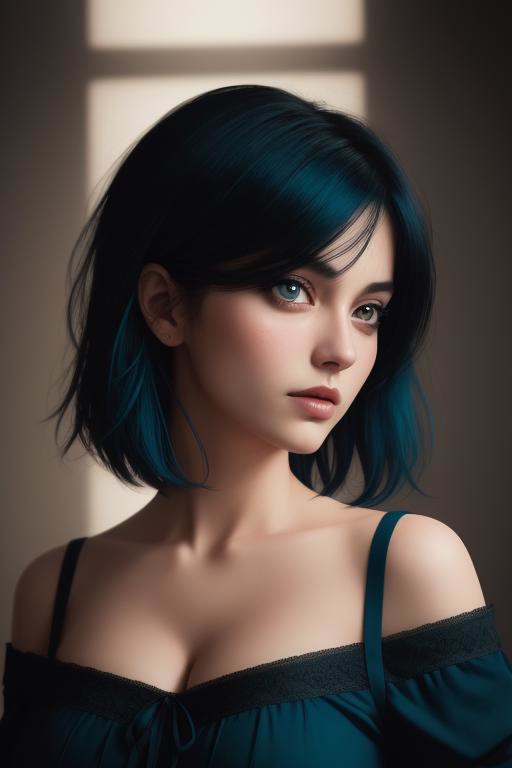 masterpiece, best quality high resolution, high contrast, professional photography, hdr, soft light, sharp focus, 1girl, pushed together cleavage, short hair, messy hair on face, lace on cleavage, small breasts, edges, sharp, teal eyes, black hair with bangs, looking from the side, attractvie pose, detailed eyes, high rich details, simple background, bad girl, charcoal sketch, upper body, sharp edges strokes, Off-Shoulder Blouse, girl with Ukiyo-e