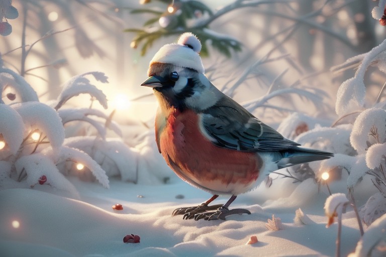 A happy cute, (robin:1.2), (bird), (wearing a winter hat), Adorable, heart warming, cheerful, detailed, bright colours, friendly expression, small size, shiny, eco-friendly, garden, winter, environmental, sunlight, shadows, digital art, whimsical, playful, intricate details, high resolution, photorealistic, joyful atmosphere, gentle, soft lighting, cartoonish style, enchanting, vivid, appealing, character design, imaginative, family-friendly, [photography, realistic, photorealistic, (8k), (highly detailed), cinematic lighting, intricate details, (high resolution), award-winning, correct focus, realistic, realistic lighting, (highly detailed), masterpiece], ((Cinematic Still-Shot)), Chr457m45m3rg3D0nMN3M1C neon,