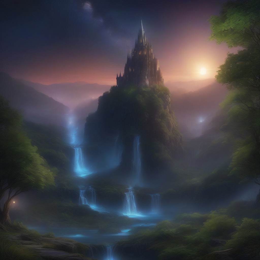 A magical Fantasy elven city-scape at night , with twinkling stars in the sky, forest all around with a waterfall in a fantasy background and setting. Masterpiece , realistic, high detailed, use 8K Ultra HD, Photorealism, best quality, high contrast art