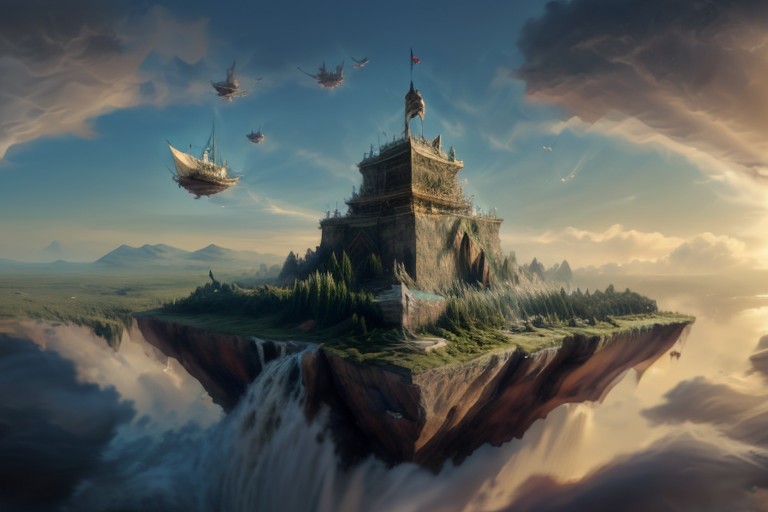 A large floating island with flying ships around. A large obsidian pyramid is the central structure of the island. floating island with flying ships, masterpiece, obsidian ((pyramid)), high quality, 8k, monumental architecture, Ziggurat, waterfall, lush landscape, nisroch, scenery, sumerian