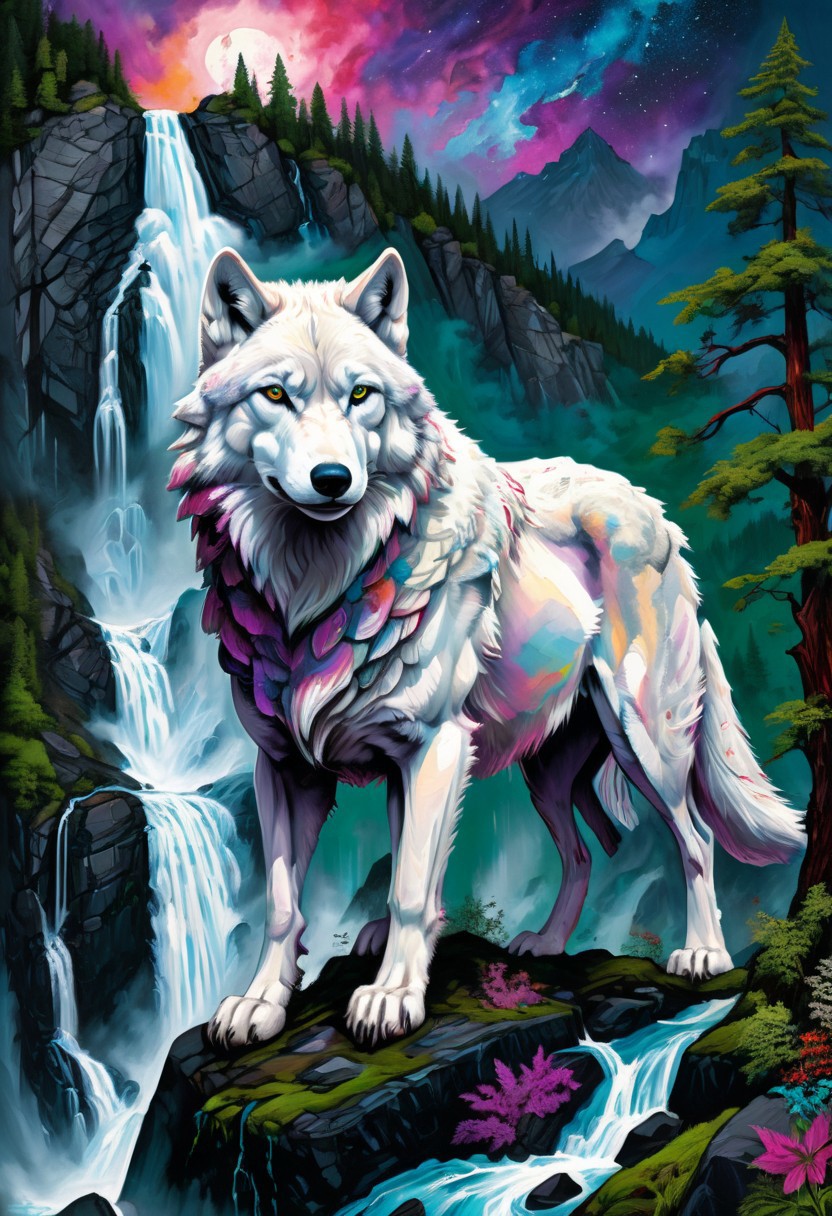 Image is a fantasy artwork featuring a magnificent white wolf standing on a rocky outcrop. A vibrant, multi-coloured comet streaks across a majestic, inky black stary sky, adding a dynamic element to the scene. The background showcases a dramatic landscape with a spectacular waterfall plunging from a tall rocky hillside into a sprawling forest with distant snow capped peaks. The overall colour palette is rich and vivid, with deep greens and blues contrasting against the bright comet. The composition is balanced, with the wolf positioned centrally, exuding a sense of strength and mysticism.