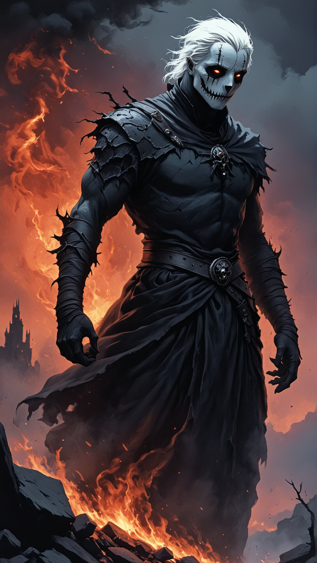 Digital painting style, (brushstrokes:1.2), fantasy A towering figure stands at the edge of a vast, charred landscape, its skin like darkened marble and eyes that burn with an inner fire as it surveys the desolate terrain; the air is heavy with the acrid scent of smoke and ash, and the ground beneath their feet is dry and cracked like the surface of the earth itself; in the distance, a parade of ghostly figures marches through streets lined with twisted, blackened spires that seem to writhe and twist like living things, their faces unseen behind masks of soot and grime; above, the sky is a deep, foreboding crimson, as if the very heavens themselves had been set aflame by some ancient, malevolent power. <lora:PainterlyFantasiaSDXL:1.2>