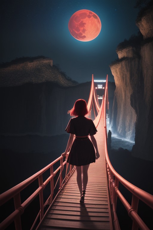 mega beautiful neon butterfly suspension bridge on the night cliff, beautiful girl walking on the bridge, rich colors, play of colors, fairy tale landscape, red moon, stardust, rainbow, macro, detail drawing, realistic, intricate details, hyper-detailed, kodak 50mm lens, professional photoshoot, full-hight scene view, intricate details, vivid colors, 50mm lens, octane rendering, professional photoshoot