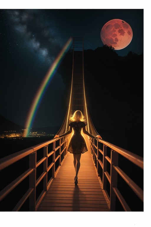 mega beautiful neon butterfly suspension bridge on the night cliff, beautiful girl walking on the bridge, rich colors, play of colors, fairy tale landscape, red moon, stardust, rainbow, macro, detail drawing, realistic, intricate details, hyper-detailed, kodak 50mm lens, professional photoshoot, full-hight scene view, intricate details, vivid colors, 50mm lens, octane rendering, professional photoshoot