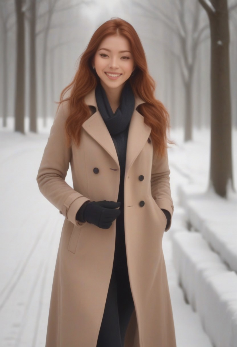 em5588, best illustration, illustration, masterpiece, best quality, ultra-detailed, photo of beautiful woman, (masterpiece) (best quality) (detailed) (8k) (HDR) (wallpaper) (cinematic lighting) (sharp focus) (intricate) 1girl, seductive, red hair. coat, smile; Winter, snow, in the park,