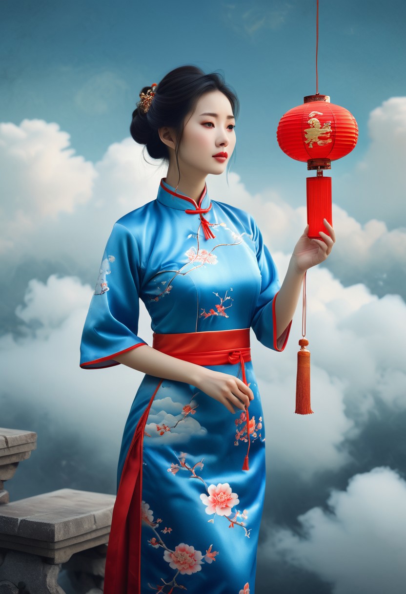 A captivating image of a serene Chinese woman in a vibrant blue Qipao dress, surrounded by soft clouds and gentle light, cradling a delicate red lantern, with elegant features and styled hair, reminiscent of classical Chinese paintings, evoking a sense of reverence and wonder, in a dreamy, ethereal style