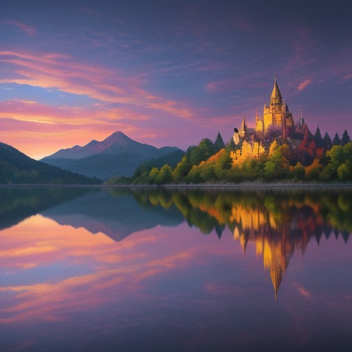 Golden castle in the distance floating in the air, glowing, morning, sunrise, colors, colorful, psychedelic colors, psychedelic, mountainso, forest, lake, clouds
