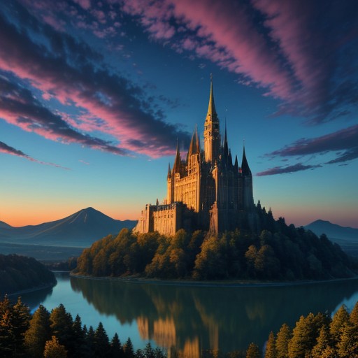 Golden castle in the distance floating in the air, glowing, morning, sunrise, colors, colorful, psychedelic colors, psychedelic, mountainso, forest, lake, clouds