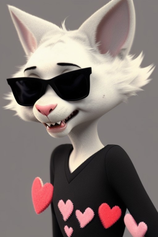 Angus_Scattergood, skinny anthro cat, white fur, cheek tuft, sunglasses, standing, bust portrait, smile, teeth, fangs, wearing black v-neck sweatshirt, red claws, floating hearts, blushing, cute, valentine, (masterpiece, highly detailed, best quality:1.3), detailed fur, cupidtech