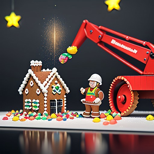 In a kitchen-turned-construction site, gingerbread men in tiny hard hats and reflective vests work on building an elaborate gingerbread mansion. One gingerbread worker operates a candy cane crane, lifting a gumdrop roof into place, while another holds a blueprint made of icing. Nearby, a gingerbread foreman yells into a licorice megaphone, gesturing at a pile of marshmallow bricks that are about to topple. The table is a chaotic mix of sprinkles, frosting, and construction tools made of candy, while a curious cat watches from the counter, ready to pounce on a stray gumdrop,Fantastic lighting. Detailed shadows.intricate details, vivid colors, hyper-detailed, ultra-sharp.