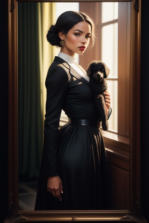 Elegant woman with a trendy poodle, hair sculpted in a show-worthy style, blending the illustrative grace of Harrison Fisher, the surrealism of Remedios Varo, the provocative contrasts of Helmut Newton, the romanticism of Gustave Courbet, and the photographic genius of Man Ray, black and white palette, strong shadows, intriguing texture, high fashion pose, glossy finish, ultra-fine, digital,, more prism, vibrant color,