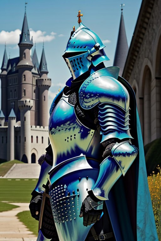 1boy, solo, solo focus, teenage, wear medium armor, turquoise armor theme, outdoor, cape, castle in the background, knight, armor, helmet