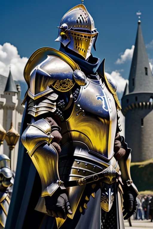 1boy, solo, solo focus, teenage, wear medium armor, yellow armor theme, outdoor, cape, castle in the background, knight, armor, helmet